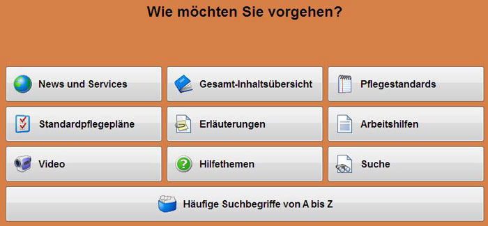 - Pflegeeinrichtungen wählen aus über 400 vorgefertigten Pflegestandards einfach den geeigneten aus, passen diesen an Ihre Bedürfnisse an und können ihn ausdrucken oder abspeichern.